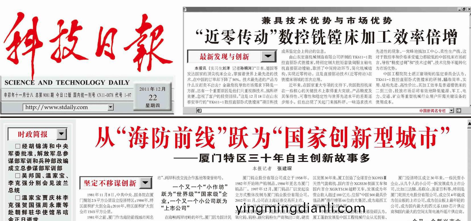 “近零傳動”數控銑鏜牀加(jia)工傚率倍增(zeng)《科技日報(bao)》 2011年12月22日總第9081期